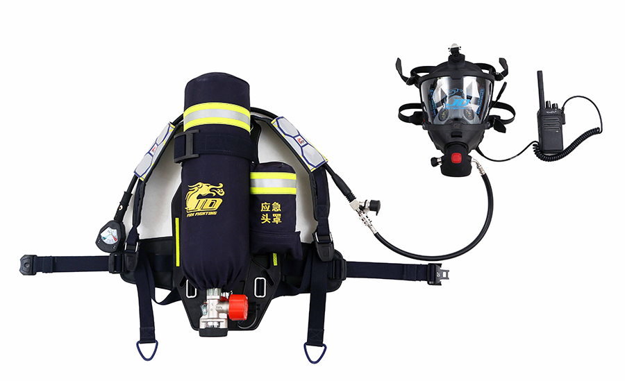 背托、氣瓶、供氣閥、減壓閥、中壓導(dǎo)管、高壓導(dǎo)管、報(bào)警器、全面罩、壓力平視裝置、通訊擴(kuò)音系統(tǒng)與對(duì)講機(jī)接口相匹配,快速充氣裝置及快換裝置等。